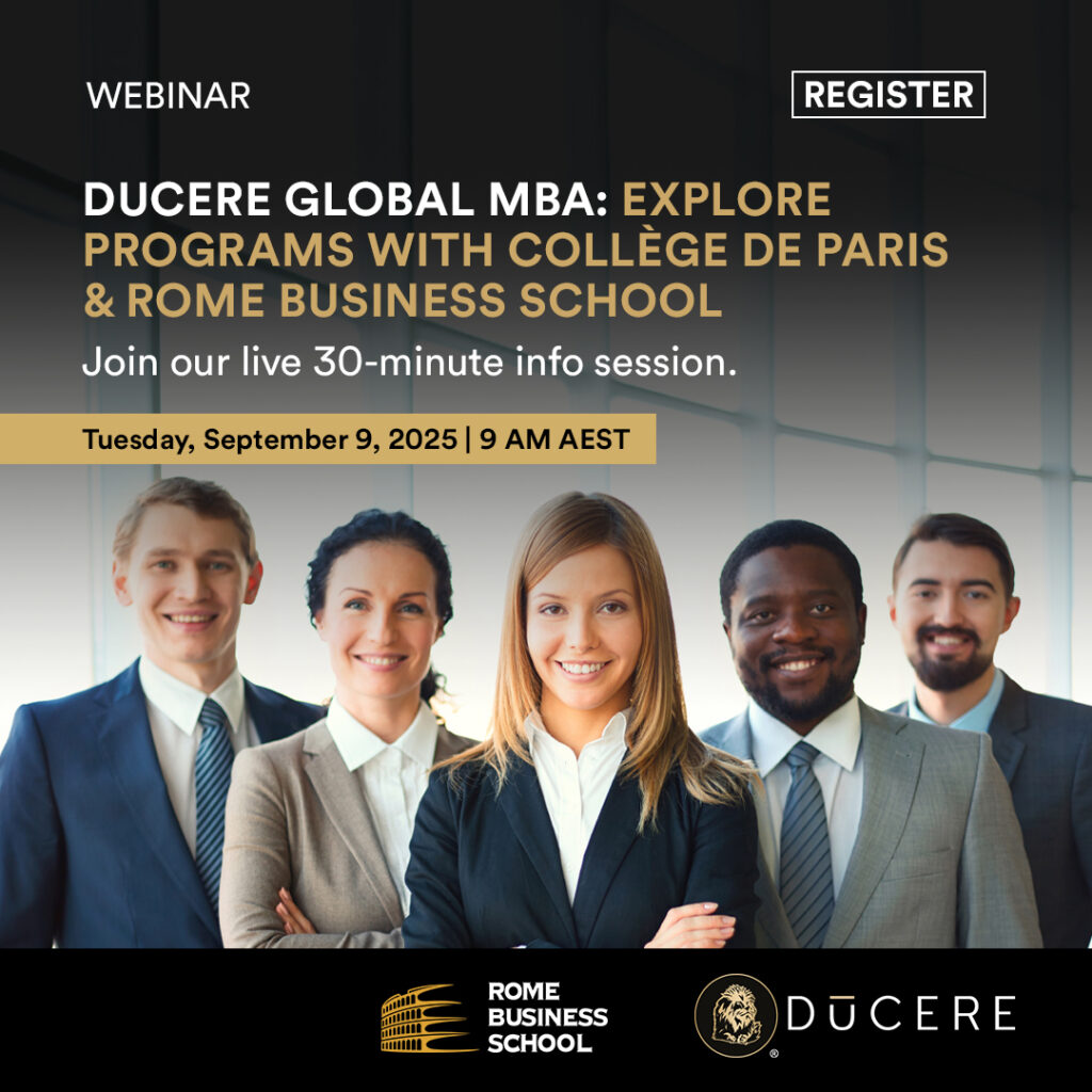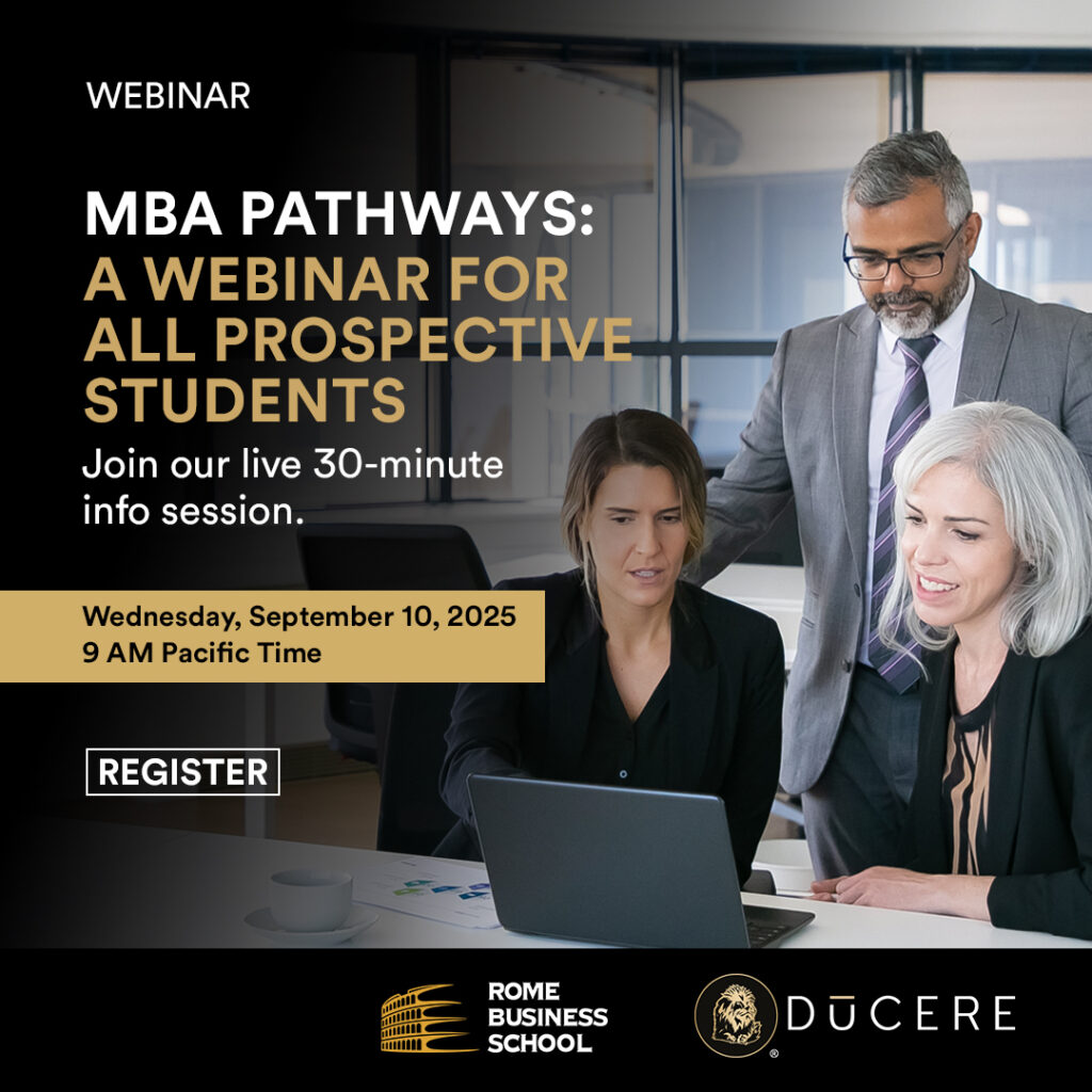 Join us for a 30-minute interactive webinar highlighting the MBA programs from Ducere Global Business School in partnership with Rome Business School. Discover how these programs can advance your career and leadership, featuring a global curriculum, special 2025 rates, and application insights. Learn from 250+ global leaders and participate in a live Q&A. Register now!